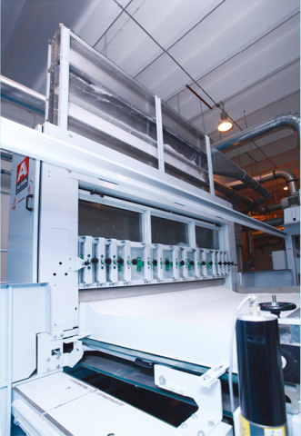 通過氣壓棉箱形成均勻棉層喂給梳理機進(jìn)行纖維分梳;雙梳理的工藝配置,不僅實現(xiàn)了四層棉網(wǎng)復(fù)合工藝,而且有效保證了纖維梳理負(fù)荷,降低了纖維損傷,提高了纖維分梳質(zhì)量和單纖化,保證了產(chǎn)品橫向均勻和克重穩(wěn)定,顯著提高了后加工品質(zhì)和效率。